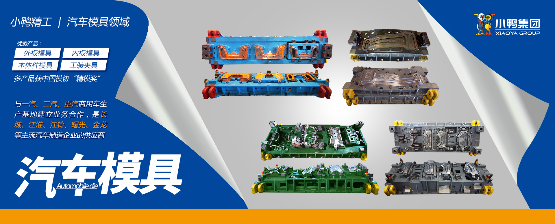 车轮装备、汽车模具、汽车零部件是山东小鸭精工机械有限公司的三大主导产业。多年来,小鸭精工秉承“用人品打造精品、用人格塑造品牌、用产品写照人生、用产业回报社会”的经营理念,坚持“质量第一,技术领先,持续创新,为客户创造价值”的指导思想,始终不渝地专注于车轮装备、汽车模具和汽车零部件的研发制造,致力于打造高端装备和汽车零部件领域的产业航母。